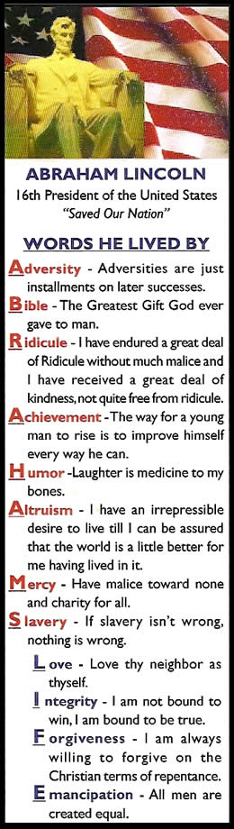 - Words He Lived By: (see the bookmark at the left containing the 12 word acronym: ABRAHAMS LIFE) This bookmark is given to everyone in the audience. Each one of these words was the fiber of Abraham Lincoln. I will present what he said and did pertaining to these words. This presentation ends with the Gettysburg Address and takes about 25 minutes. This is appropriate for all audiences.