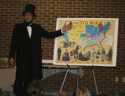 - The War Years: This detailed presentation is for the real history buff. It begins with one of Lincolns debates with Stephen A. Douglass in 1858 and leads into my nomination as the first Republican President of America. It uses the 34 state map (shown on this site) with emphasis on the succeeded states forming the Confederacy and setting the stage for war. I portray many details of each of the four years of the war reciting many parts of different speeches throughout the war and of course stories and a joke or two. This is a very historical portrayal and is my personal favorite. It ends with the Malice toward none and charity for all messages as Abraham Lincoln prepares the country for reconstruction. This program is 45 minutes.